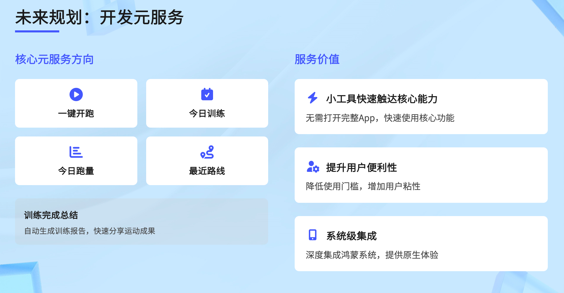 聚焦核心高频功能,打造“无需打开完整APP即可快速使用”的元服务,包括一键开跑、今日训练、今日跑量、最近路线、训练完成总结等方向,核心价值在于: