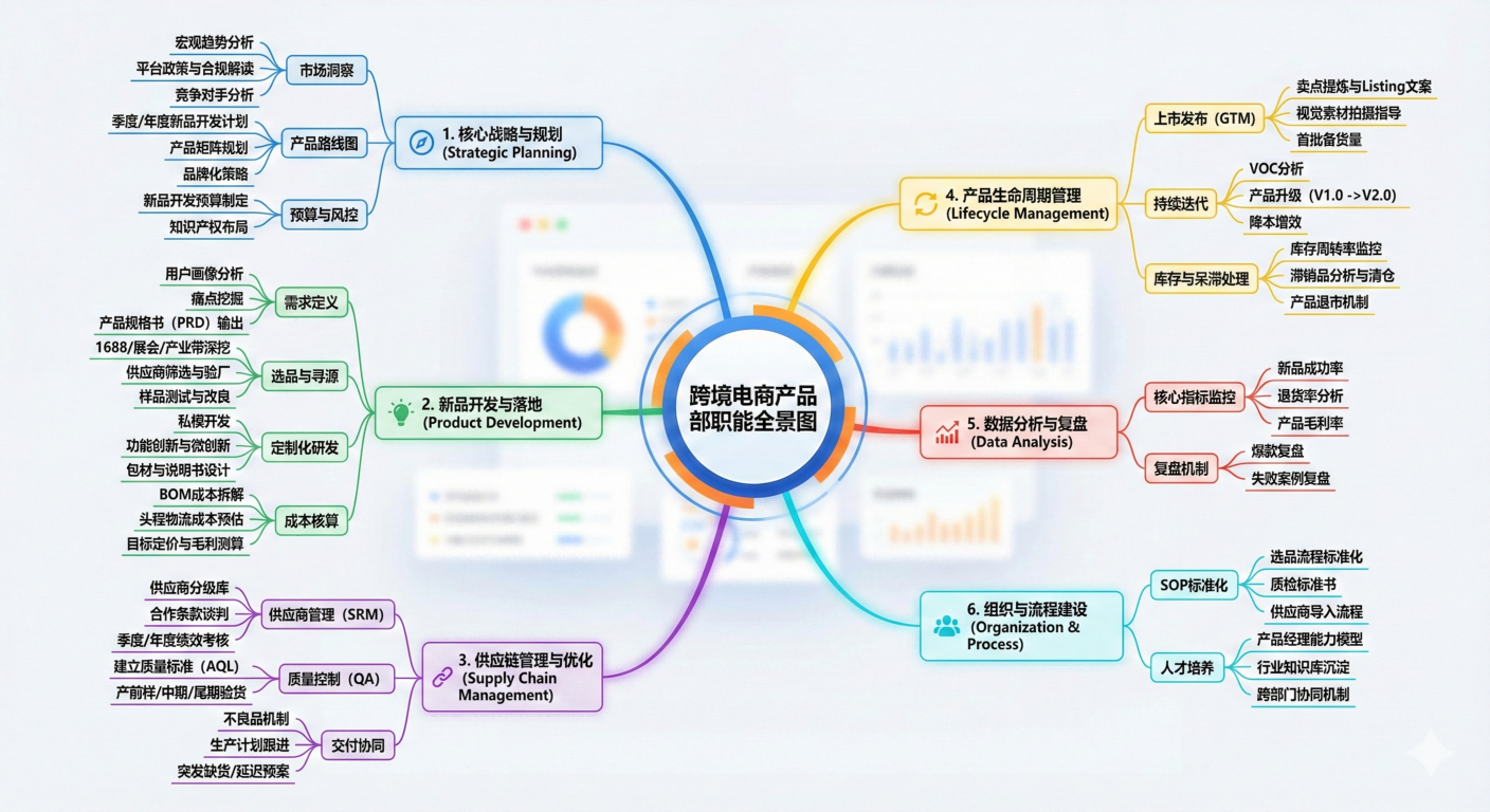 作为一个产品总监,我的视角不能仅仅局限于“找什么卖”,更要关注战略规划、生命周期管理、供应链深度整合以及利润最大化。最近,在规划团队建设和业务规划时,我梳理了一份《跨境电商产品部职能全景图》。