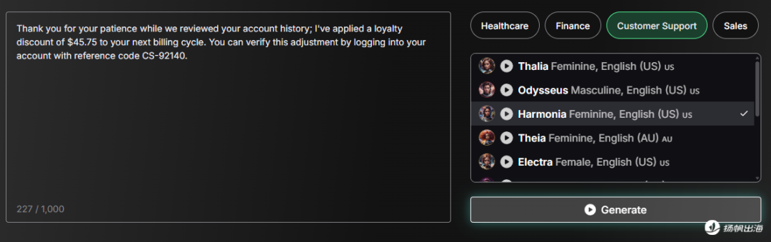 相反,在文字转语音的过程中,支持1000字的文本输入,这里也提供了医疗、财务、销售等工作场景的文字模板。同时还有海伦娜、露娜、奥德修斯等有不同口音(如英音、美音、澳大利亚音等)、性别的声音模板,且模板前都有对应的角色形象。虽然这些角色所展现出来的是声音,但实际上也内在嵌入了差异化的性格特点、年龄等拟人化特征,每个角色都有自身所对应的一套标签。