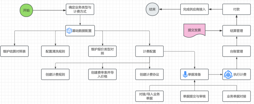 单据准备与计费:接入业务单据并审核,执行计费操作,生成台账数据,进入结算流程。
