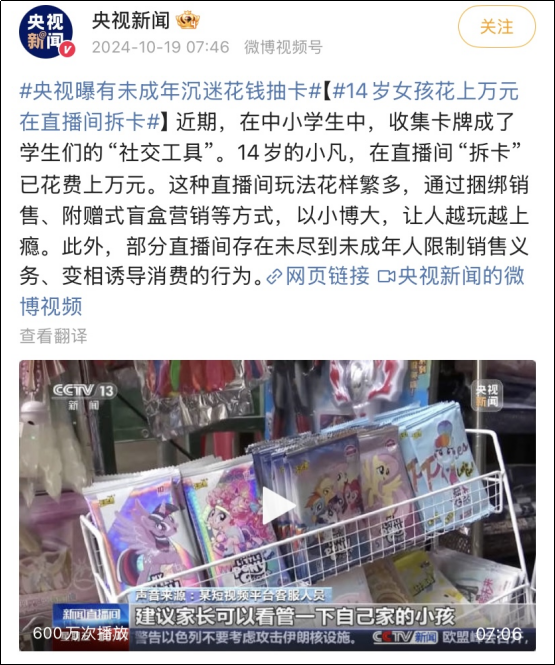 央视新闻曾报道,14岁女孩花上万元在直播间拆卡。另有媒体报道,有初中生在抽卡直播间3个月花了12万。