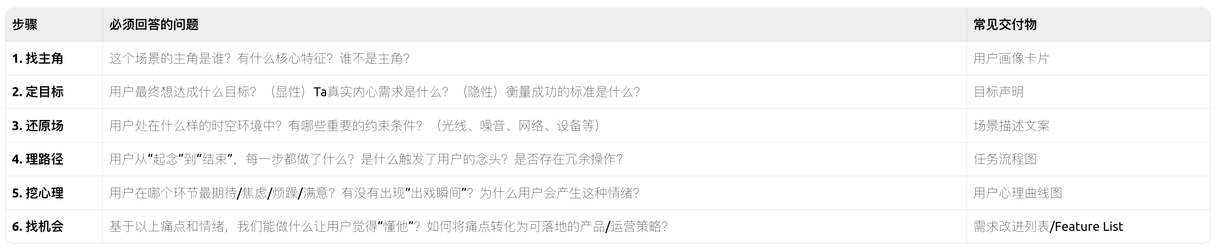 结合你笔记里的核心流程,我整理了一套可直接套用的标准化步骤,无论是新产品立项、功能迭代,还是求职时准备案例,都能直接用。这套流程就像搭乐高积木,每一步都有明确目标和产出:确定目标角色→设定核心目标→还原时空环境→梳理行为路径→挖掘心理状态→寻找改进机会点。