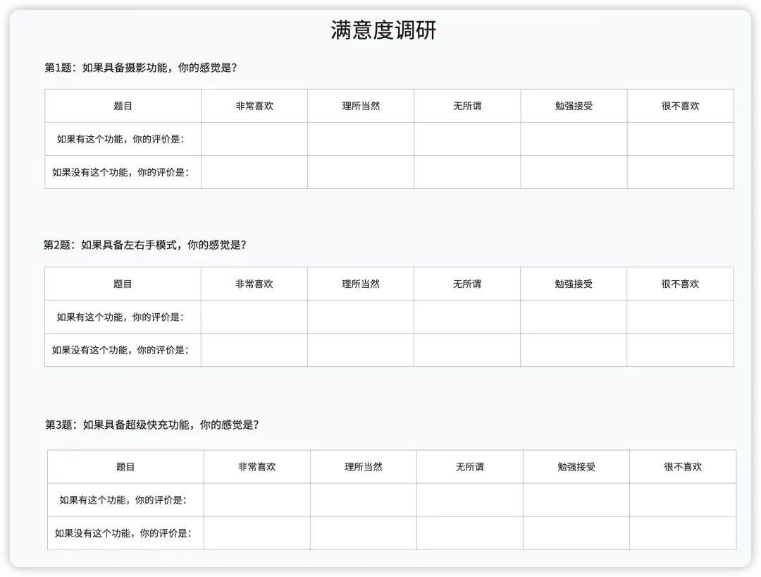 Kano问卷的精髓在于其成对的问题结构。针对每一个待评估的功能点,都需要向用户提出两个问题: