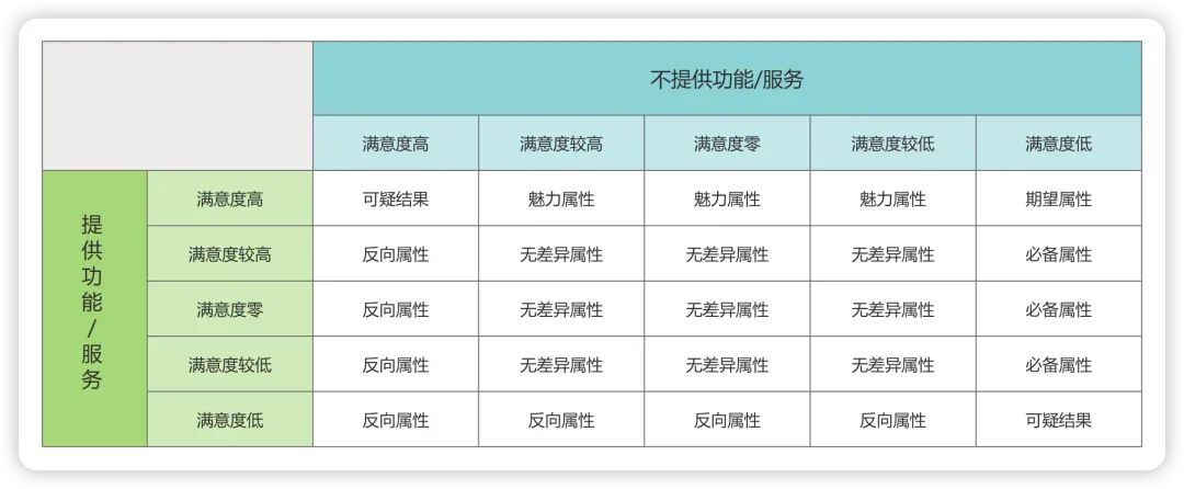 Kano评估表:通过功能性问题和功能失调性问题的答案组合,确定每个功能的属性分类。