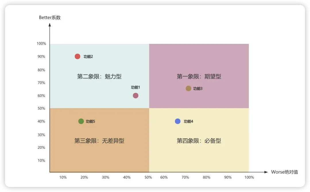 该系数表示如果提供了某个功能,能够增加用户满意度的程度。数值越接近1,表示其提升满意度的潜力越大。