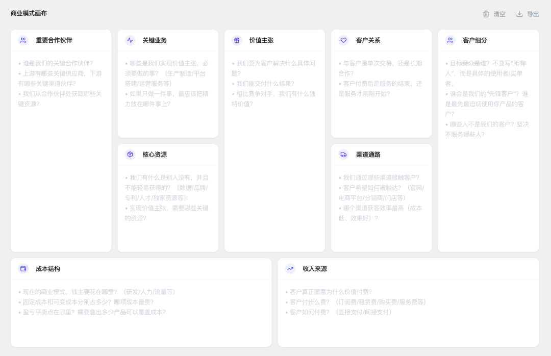 对于创业公司来说,框架比蛮干更重要。我们一定经历过,为一个 idea 心潮澎湃,但真要将其变成一家公司,又无从下手的时刻。商业模式画布,就是能够让大脑中一些混沌中的思绪,变成可落地和执行的方向,它真正的意义,就是让创业者在回答 9 个问题的过程中,理清楚自己的思绪。