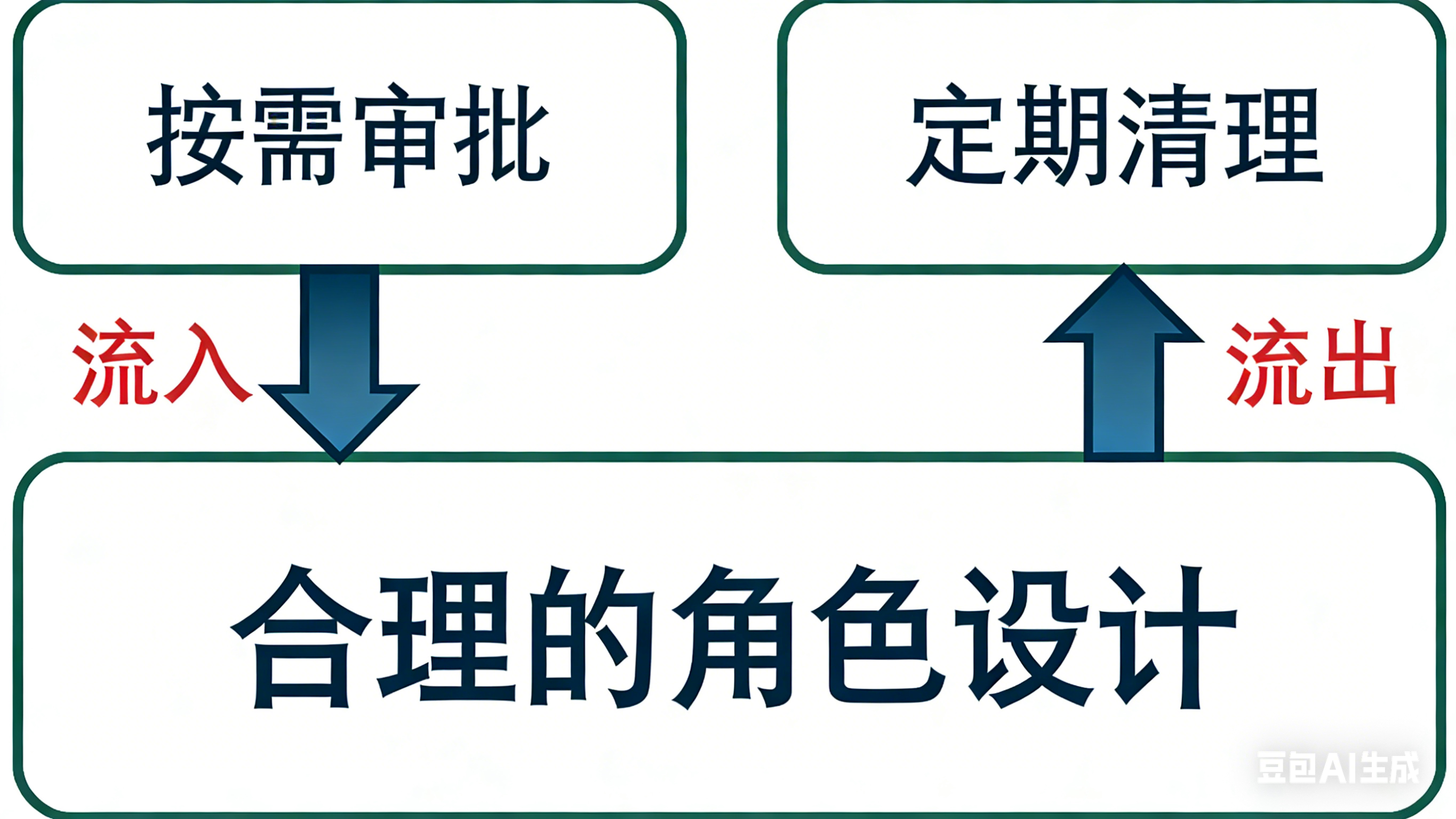 (流入)在合理的角色基础上, 按需审批控制权限被正确授予,确保流入正确。通常用户申请对应角色时,需要由他的上级和角色对应负责的业务管理员审批通过,以避免用户申请了不合理的角色。针对一些平台敏感的角色,审批有可能更加严格,增设敏感权限审批人评估权限申请的合理性。