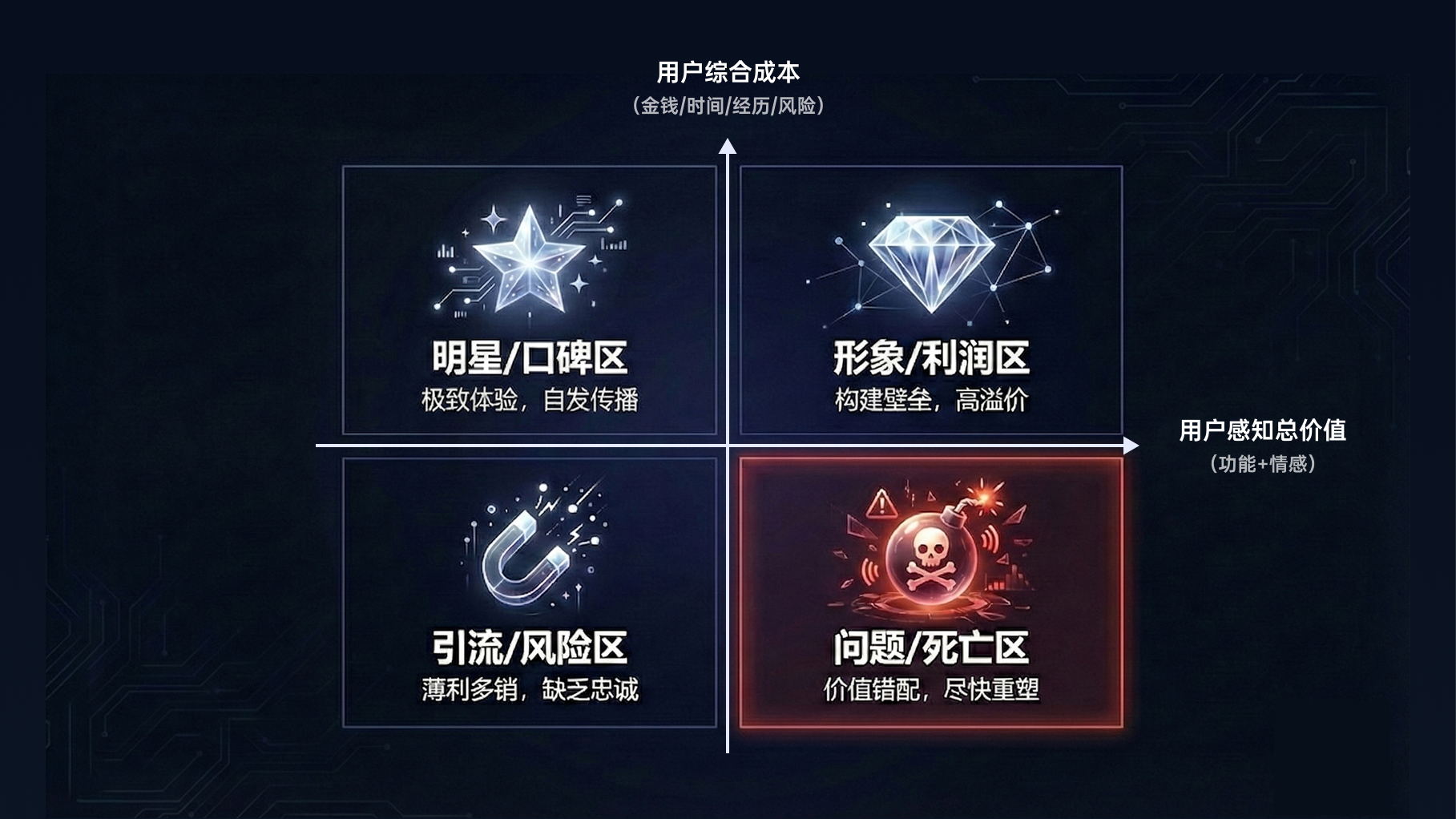 另一种是成本结构臃肿,产品本身可能有点价值,但因为糟糕的设计,反人性的流程,或者高昂的维护费用,导致用户综合成本急剧飙升,最终价值被成本完全覆盖。