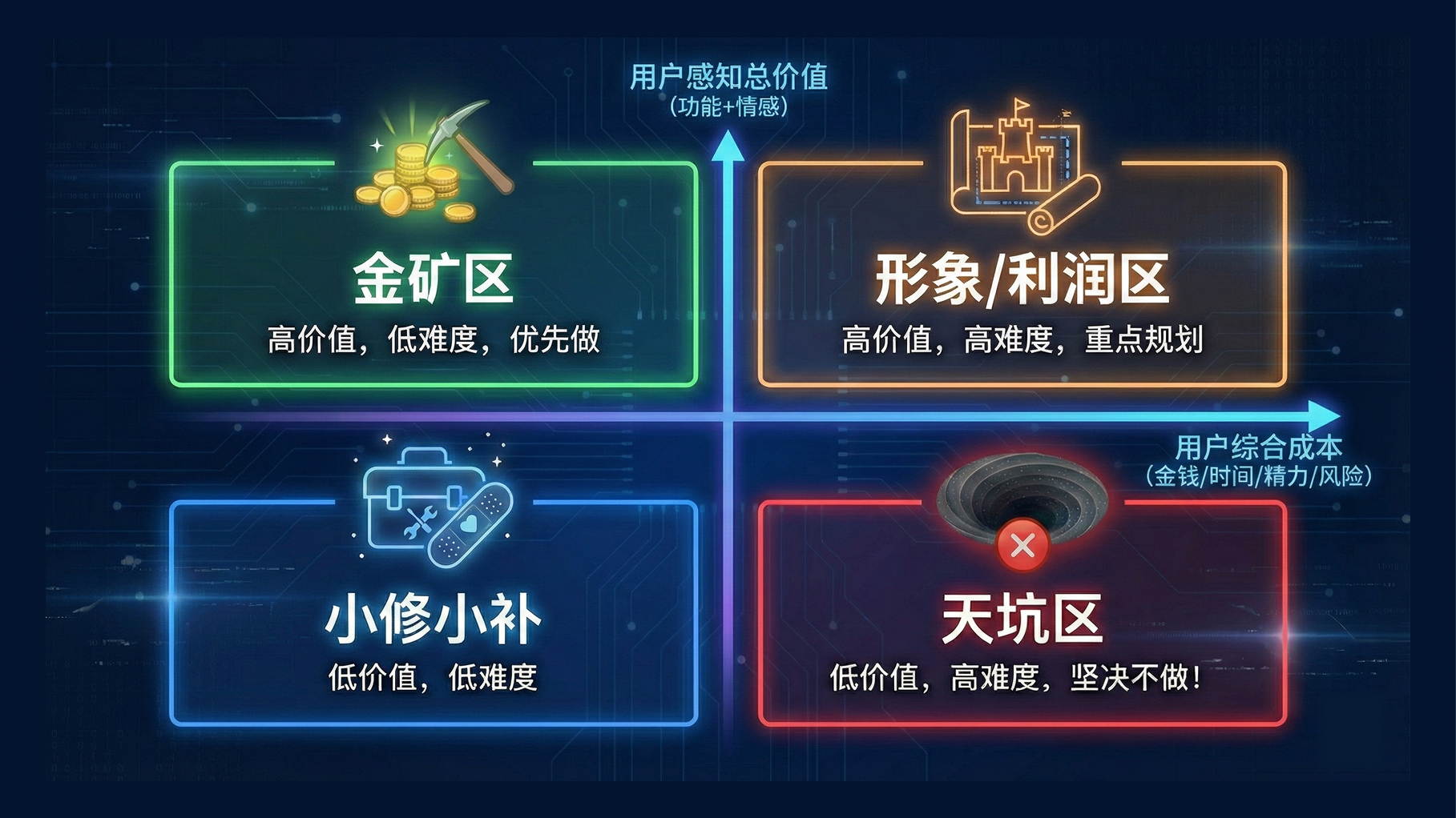 你看,把价值和成本这两个维度拆解开,我们的视角一下就开阔了,我们不再是盯着一个功能点反复纠结,而是开始系统地思考,我们到底为用户创造了什么?又让他们付出了什么?