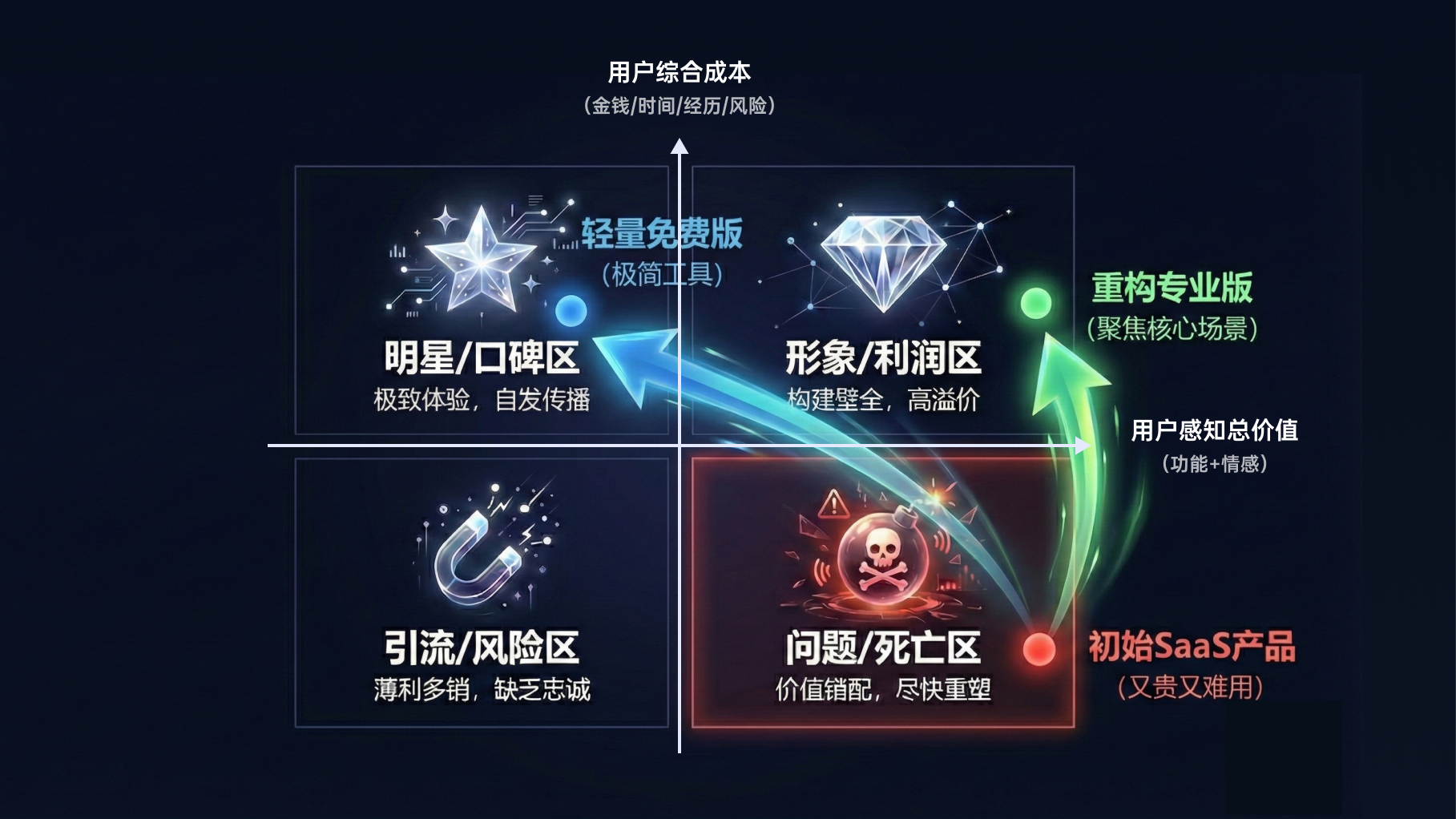 “向左迁移”,意味着我们要对产品的“用户综合成本”动大刀,既然短期内无法提供超高价值,那能不能让成本降下来,比如,把那个大而全的平台,拆分成几个小而美的独立工具,每个工具只解决一个核心问题,界面极简,操作无脑,价格也大幅降低,甚至可以推出免费版,先让用户无门槛地用起来,感受到一点点价值,再引导他们付费,这条路意味着我们要放弃做“平台”的执念,变得更务实。