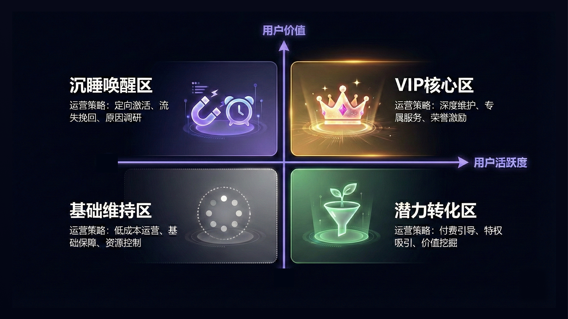 - 低价值-低活跃用户:这部分用户量可能最大,他们对产品既没贡献也没黏性,对于他们,如果资源有限,我们的策略可能是“淘汰”或者说“维持”,不需要投入太多精力,保证基础体验即可。