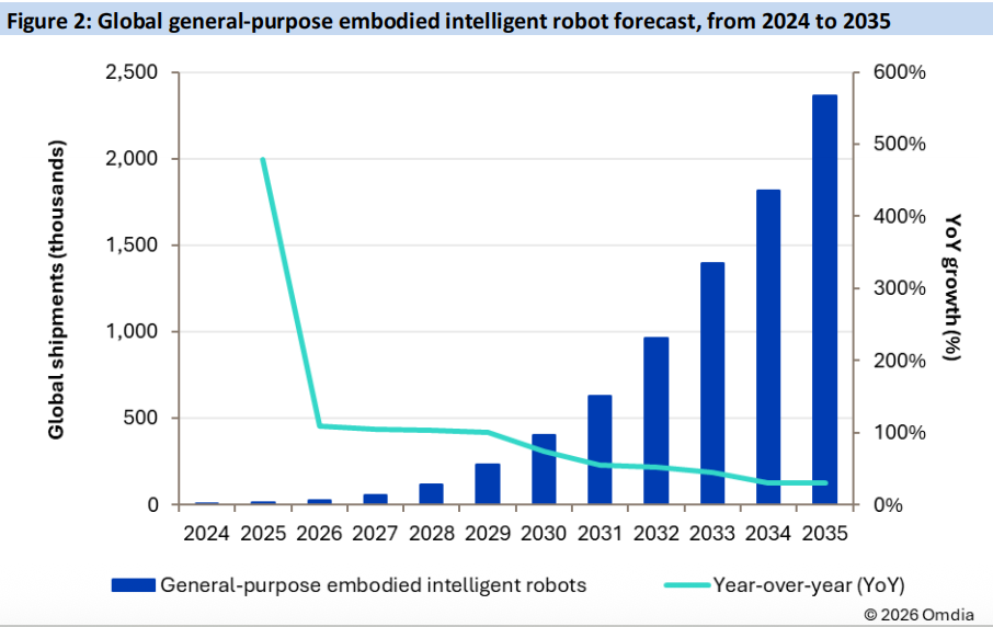 在具身智能领域,中国展现出软硬协同的产业链优势。Omdia数据显示,2025年全球人形机器人出货量约1.3万台,前十厂商中六家来自中国。报告预测2035年出货量将达260万台。该领域主要看两条主线进展:一是“大脑”,新型模型架构或于2026年下半年出现突破;二是灵巧手,目前仿生手研发“每个关节都很灵活,不同关节中用的钢材料也不一样,远超外界想象”。