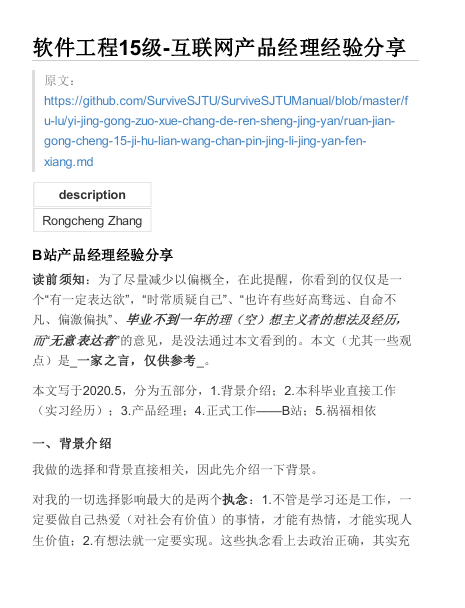 今天想聊聊,我是怎么接触到产品经理这个岗位的,最开始了解到产品经理是通过上交的学生手册,先声明哈,我不是上交的,这本小册子吧,很薄,写的内容跟我想象的还是有挺大区别,具体的内容可以理解为大学的生存手册,很系统的告诉你可以在大学去做些什么,一方面可以对大学进行一个基本的祛魅,另一方面,可以让你有一个方向,不在迷茫的奔波在大学校园中,我看这本书的时候,是在大二的时候,在这本书的结尾处,有一个学长学姐分享的板块内容,在里面就有一个跟我同专业(计科)的学长分享了一下自己的求职经验上海交通大学生存手册