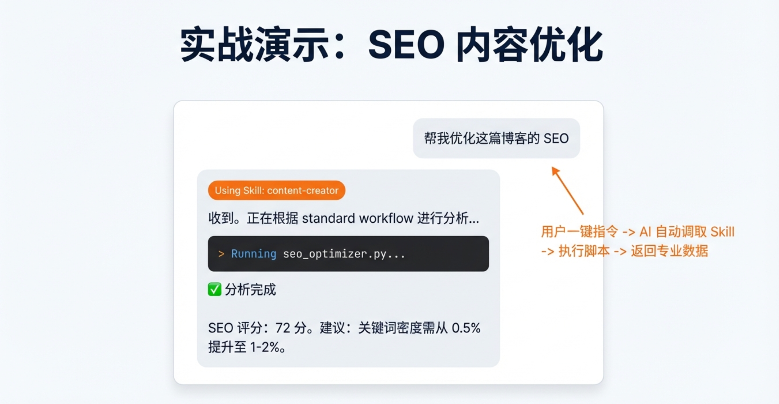假设你已经安装了内容创作的 Skill,当你对 AI 说:「帮我优化这篇博客的 SEO」