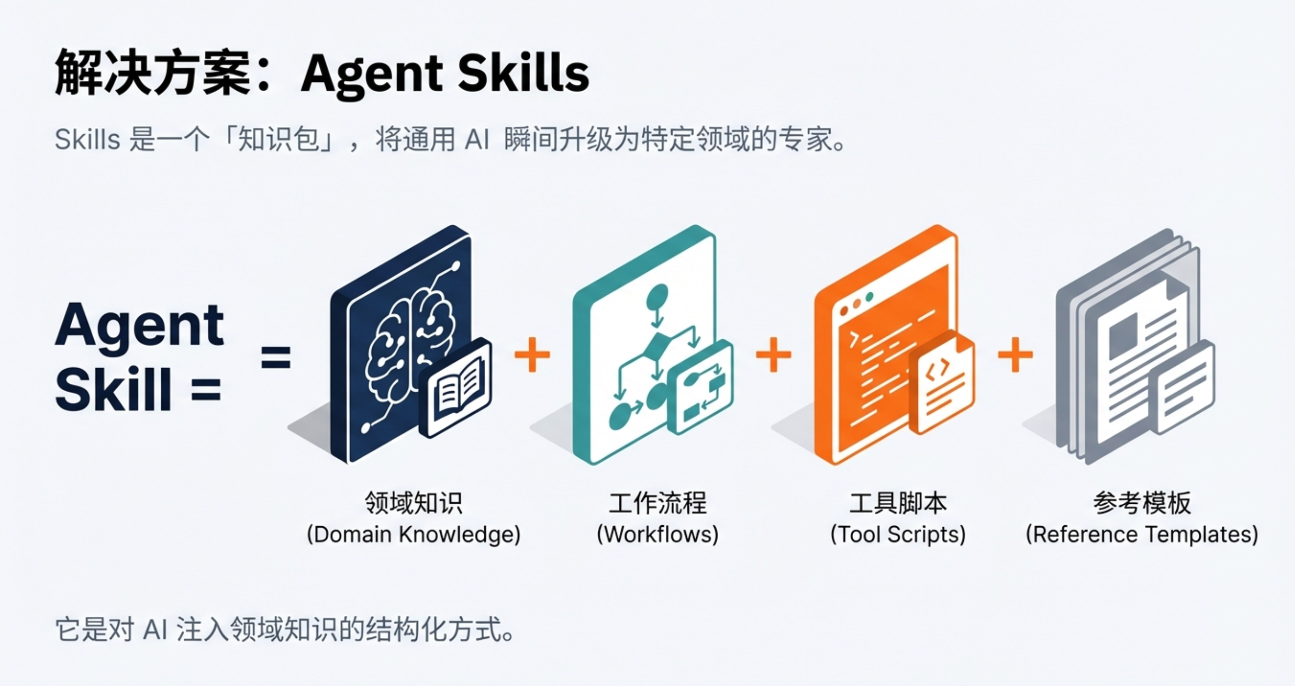 Agent Skill = 领域知识 + 工作流程 + 工具脚本 + 参考模板