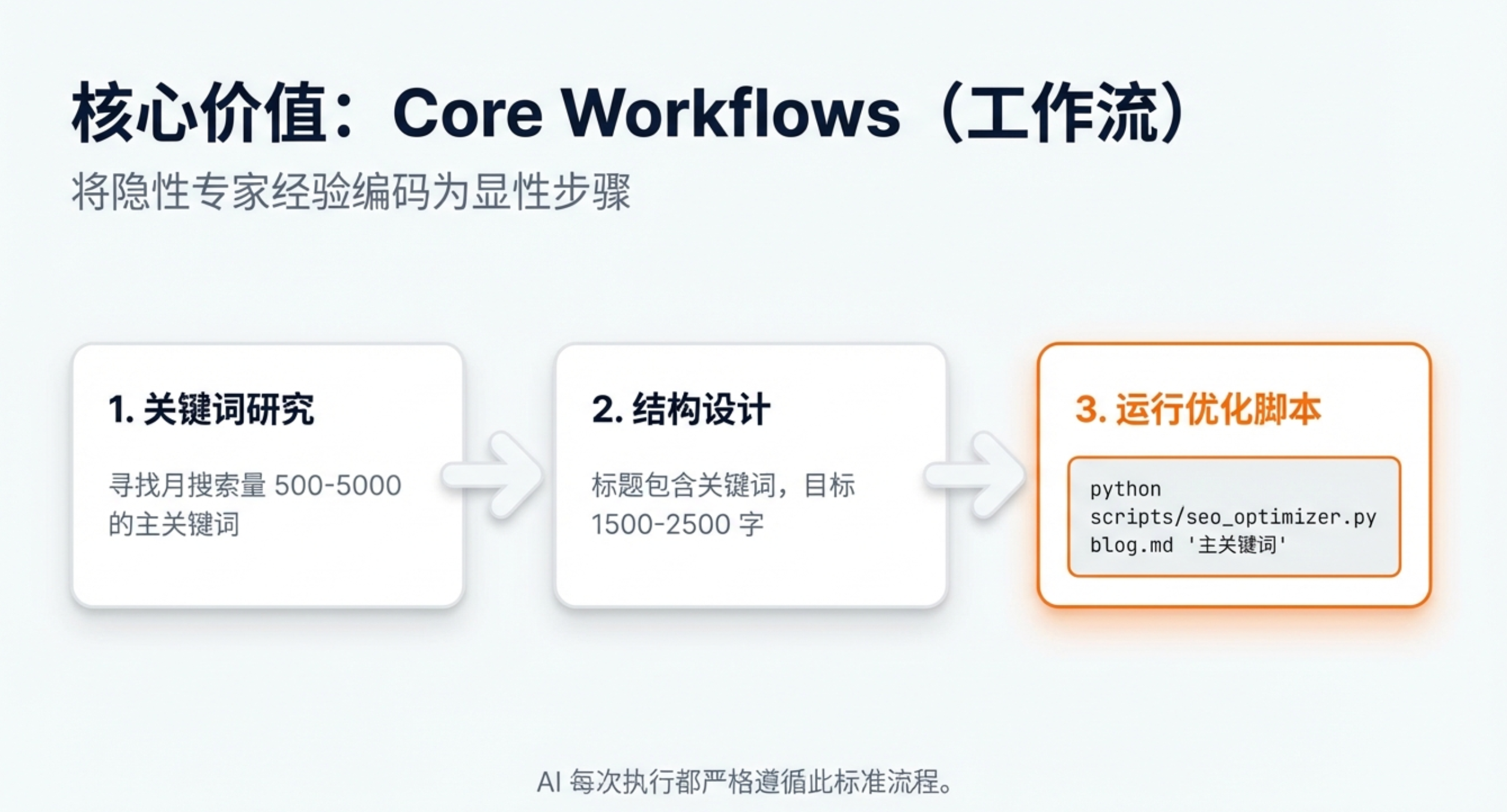 工作流程把专家知识编码成了可重复的步骤,确保 AI 每次执行任务时都能遵循最佳实践。