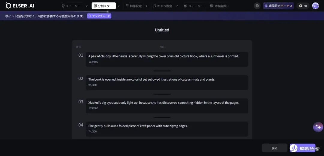 当草稿输入完成后,系统会自动将内容拆分为更细化的脚本结构,同时支持手动调整内容或新增片段,以便用户梳理故事逻辑。