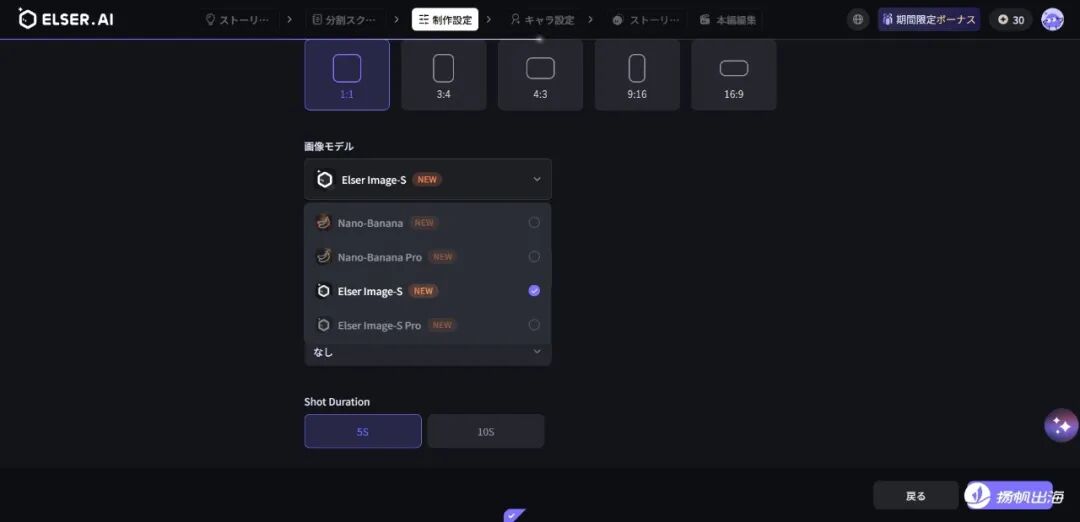 进入内容生产阶段,用户可设置生成名称、画面比例、模型类型及时长。模型层面,除了接入Nano Banana Pro,Elser.AI还提供自有图像模型Elser Image-S/ Image-S Pro,以及视频模型Elser Video-S / Video-S Pro / Video-K。