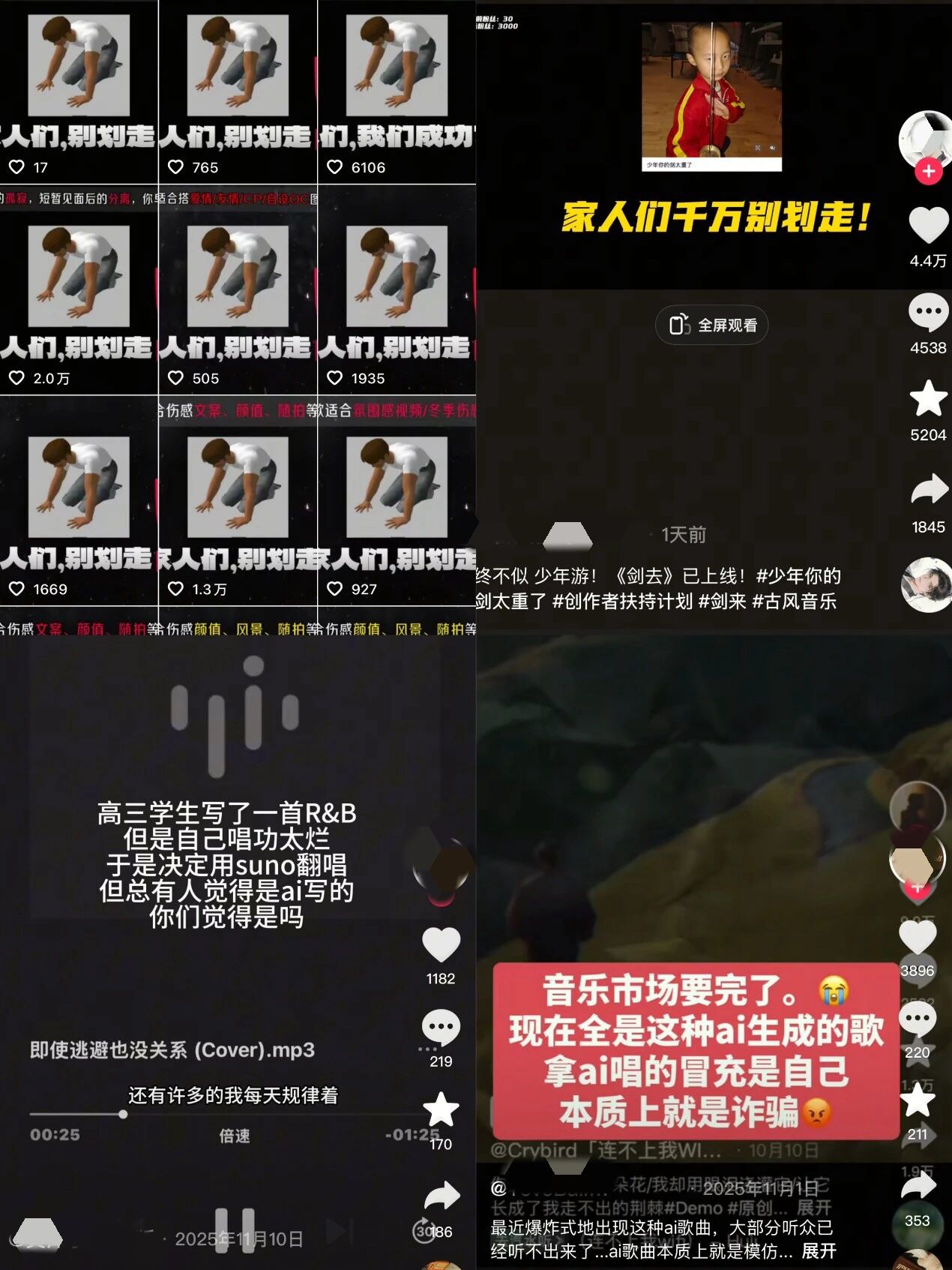 从评论区看,不少用户都被蒙在鼓里以为账号背后的,真的是一个熬夜写歌、反复修改、怀揣音乐梦想的草根宝藏音乐人。却很少意识到,那些看似“真诚”的作品,往往只是算法与模板批量生成的结果,为的只是骗取流量,起号变现。