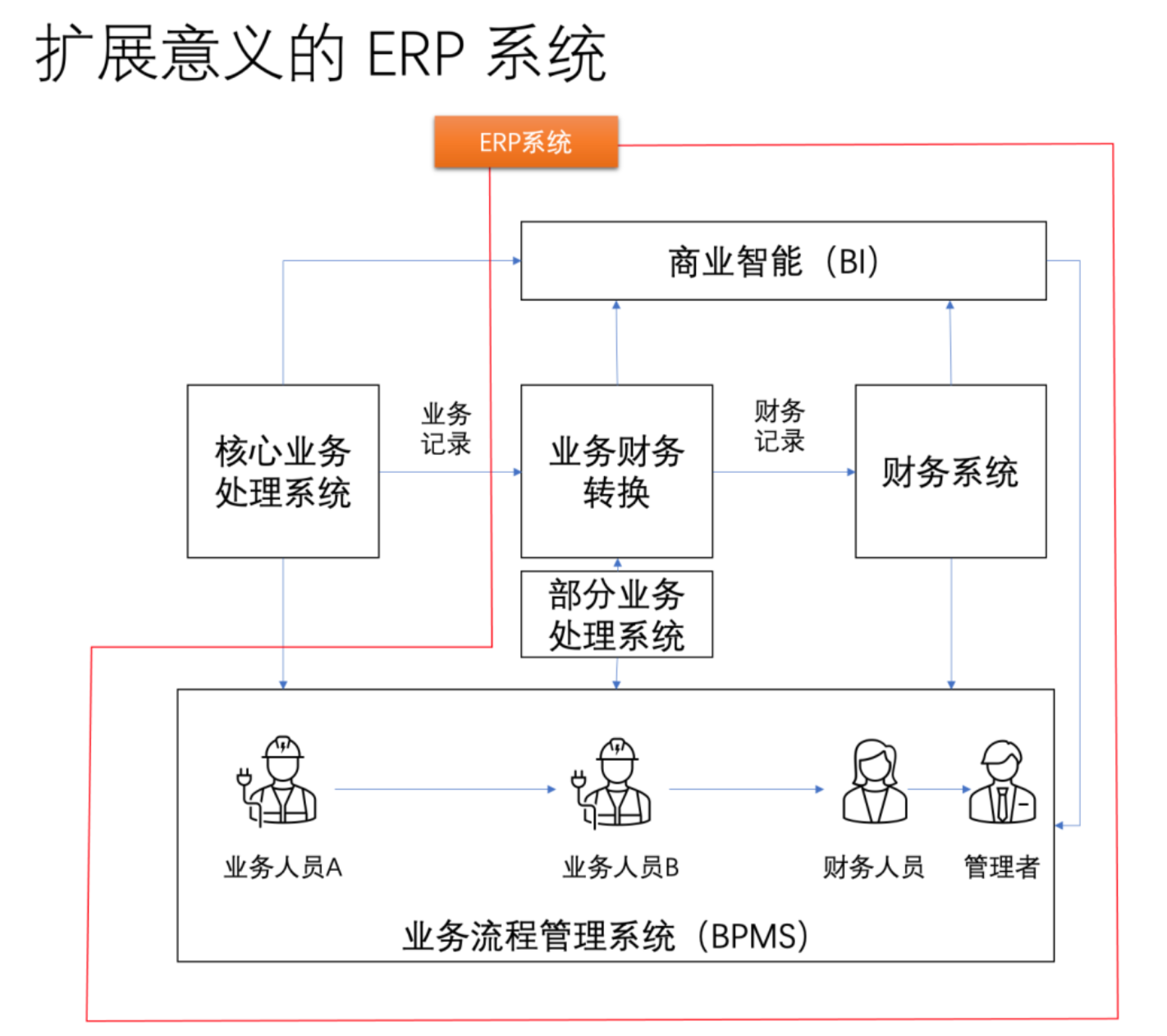 最近十年来,BI 和 BPMS 在企业内开始普及,因为他们和 ERP 联系比较紧密,今天也可以把这两个系统纳入 ERP 系统的范畴,可以称为“扩展意义的 ERP 系统”。