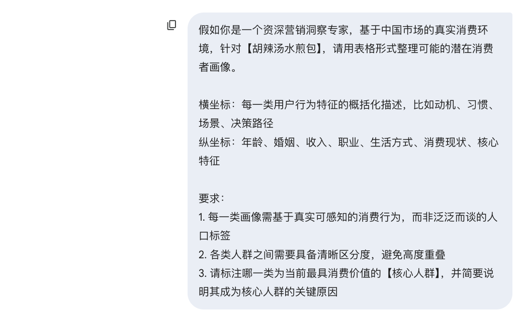 这个提示词强制AI从“用户真实行为”切入,而不是从年龄标签等常规角度,避免AI只输出“25至35岁女性”这类谁都会说、却对产品设计帮助不大的空话。