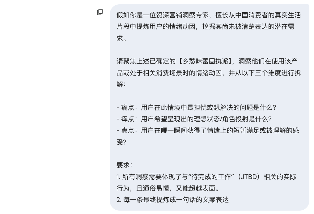 这些高质量洞察,不是我花几万块请咨询公司做的,也不是我花几个月做用户访谈得出的。我只用三段提示词,花不到10分钟和AI对话就拿到了。