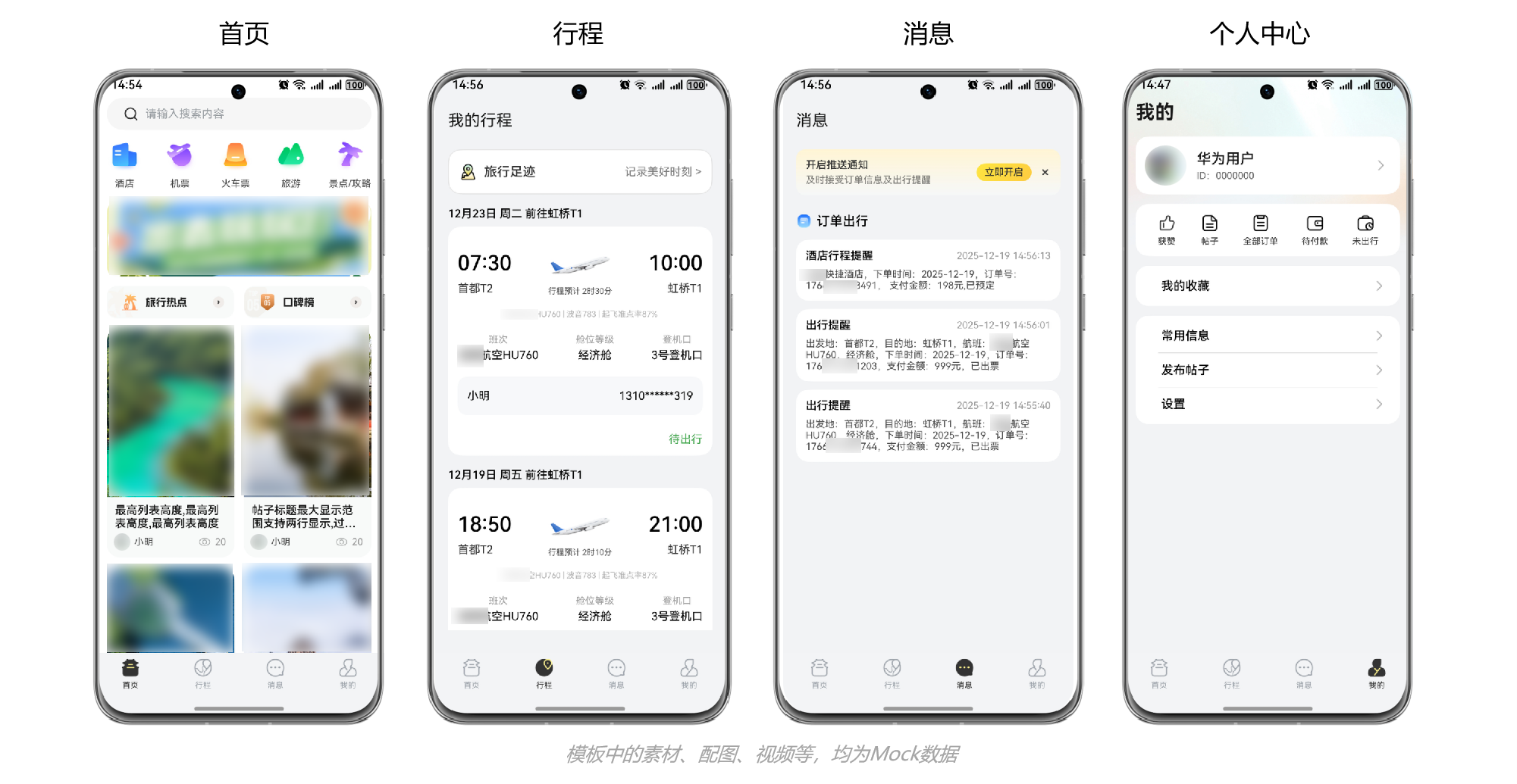 本模板为旅游类应用提供了常用功能的开发样例,模板主要分首页、行程、消息和个人中心四大模块。本模板已集成华为账号、微信登录、消息管理、应用更新检查、意见反馈、实名认证等服务,采用模块化架构设计,支持多设备适配,只需做少量配置和定制即可快速实现旅游攻略应用的核心功能。