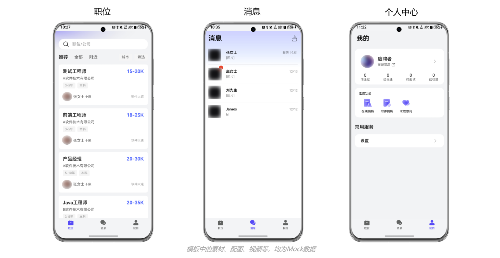 本模板为招聘类应用提供了常用功能的开发样例,模板主要分职位、消息、个人中心三大模块。本模板已集成华为账号、即时通讯、推送、分享等服务,支持深色模式、适老化、无障碍等特性,提供完整的招聘应用解决方案,只需做少量配置和定制即可快速实现招聘应用的核心功能。