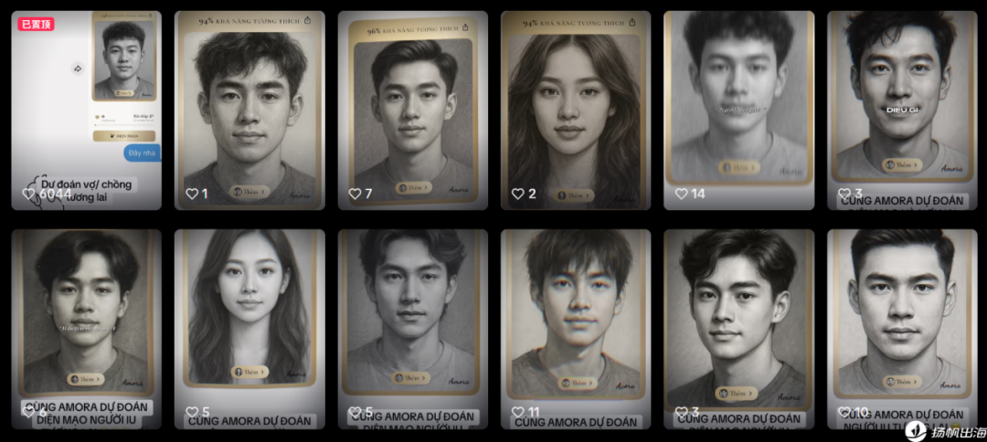 更直观的差异化设计,则体现在“灵魂伴侣画像”本身。在官方账号于TikTok发布的视频截图中可以看到,Amora宣传的生成人像明显减少了欧美五官模板的占比,更多呈现出偏亚洲面孔的画像特征。
