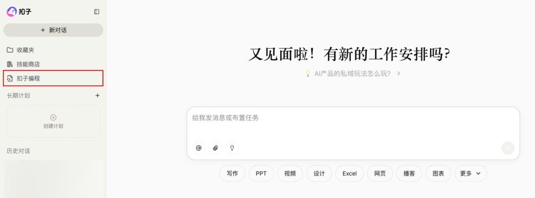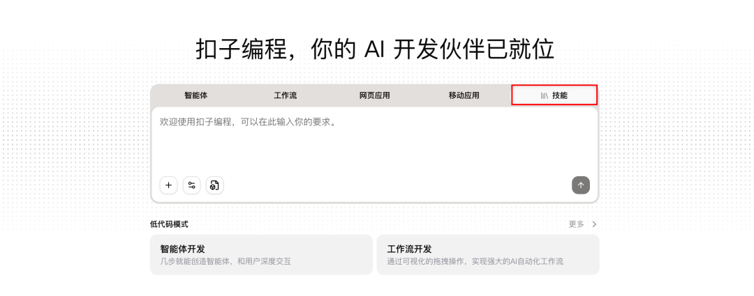 另一个则是扣子编程,具备了 AI Workflow、Vibe Coding 等各项能力,以及我们要用上的 Skill 开发功能。