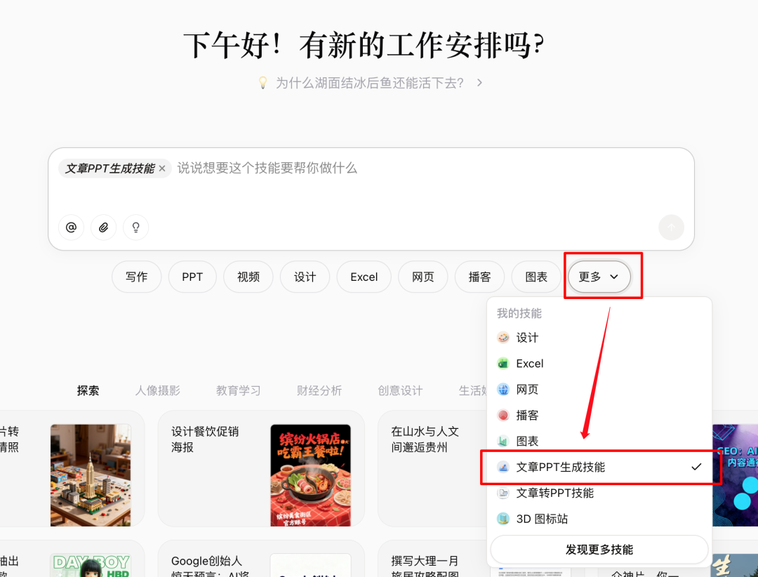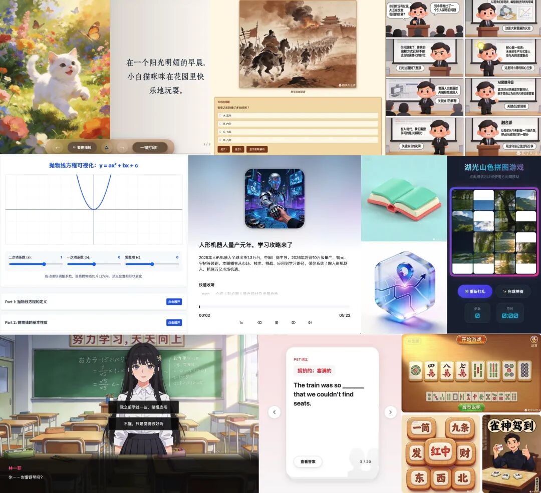 - 可视化生成类:基于前端网页或 AI 图片生成能力,互动教学课件、 文章转 PPT、古诗插画生成