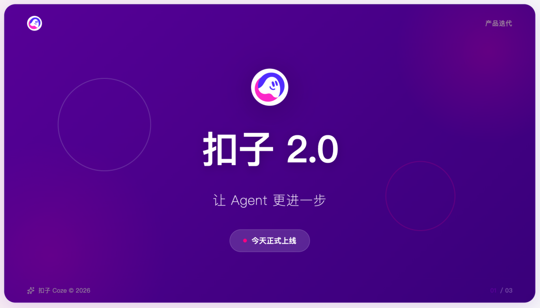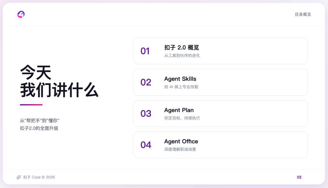 比如把扣子这次 2.0 迭代的官方通告,改为符合品牌色的 PPT 效果: