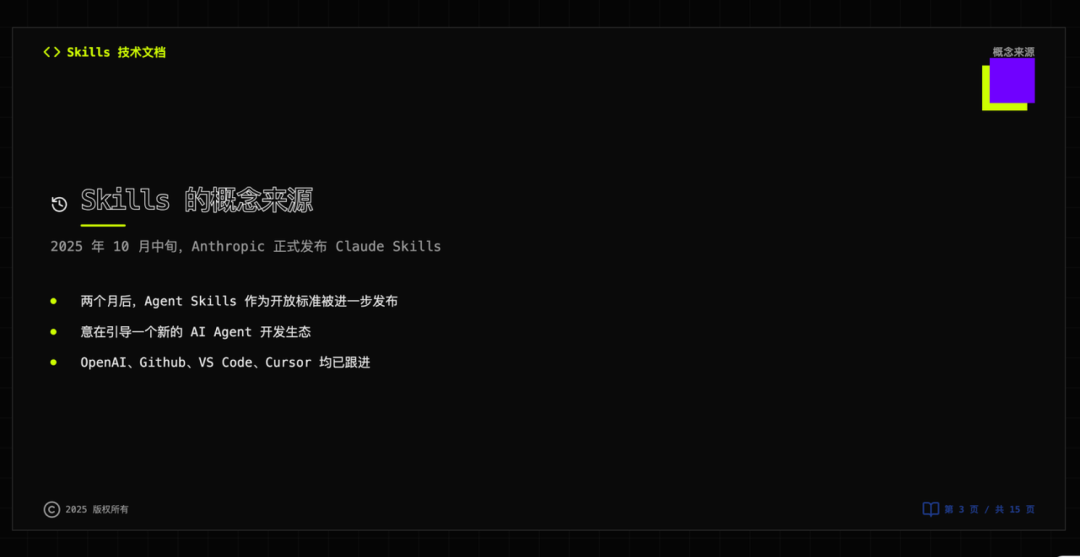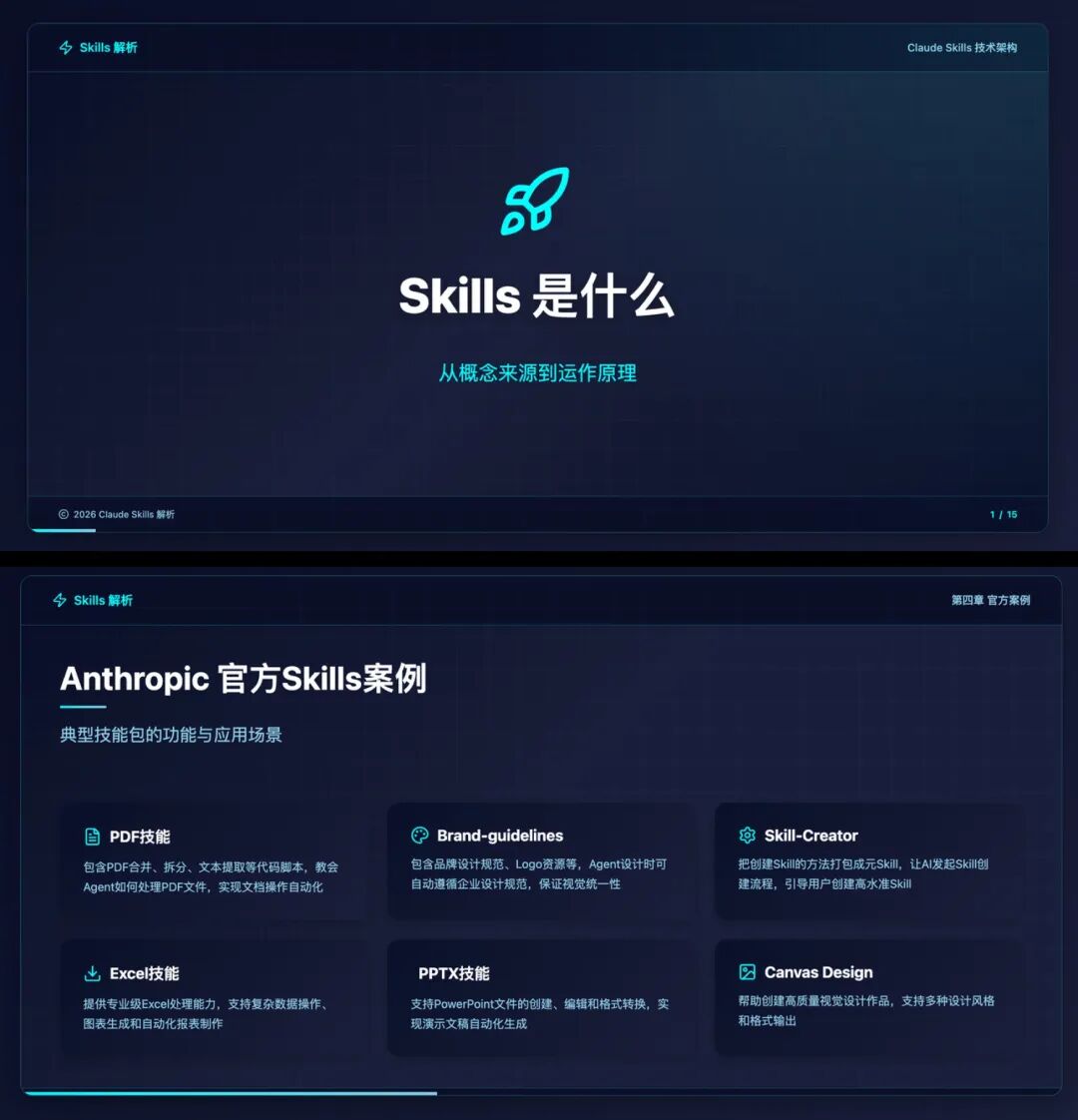 PPT 化我写的 Agent Skills 科普,采用深色科技风格,利用合适版式,展示信息。