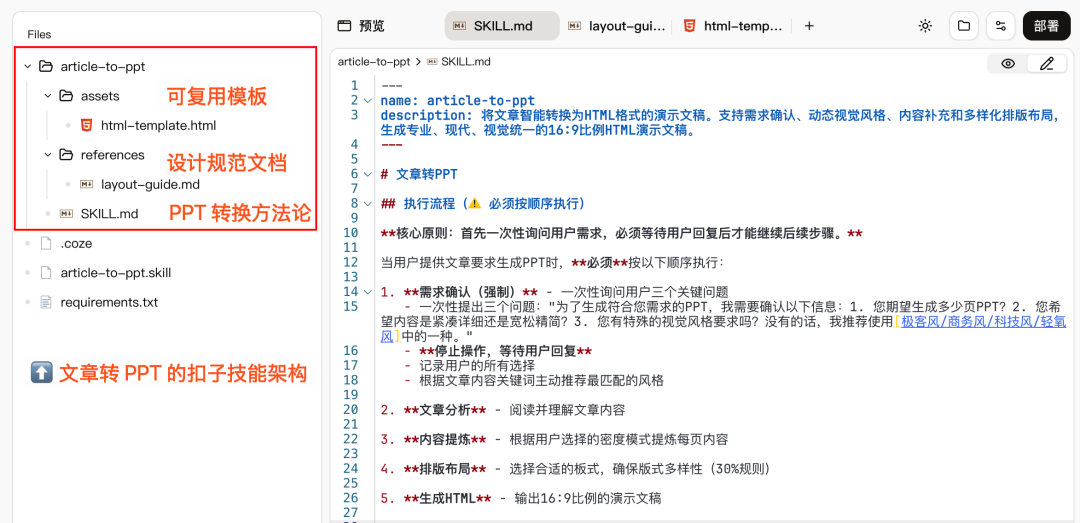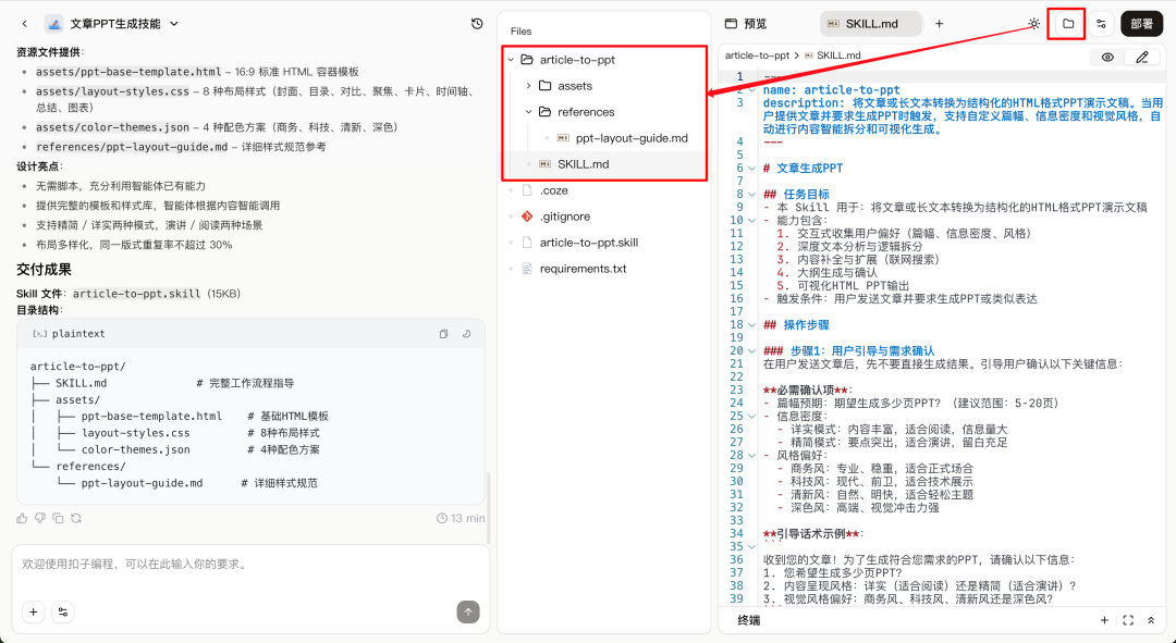接下来,我用一个「从 0-1 开发文章转 PPT Skill」的例子,讲讲如何在扣子上设计一个 Skill。