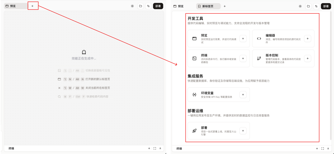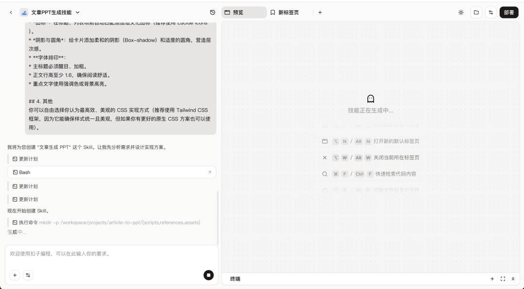 左侧是主要交互区,直接通过自然语言对话沟通,可以实时、清晰的的看到当前任务进展。右侧是常见工具区,预览用于功能测试右侧有个部署按钮,可用于技能开发完成后的发布。