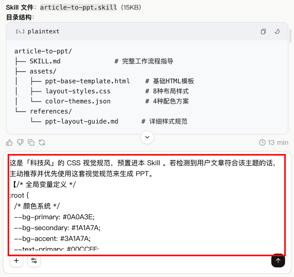 SKILL.md 负责告诉 Agent,如何进行自动化的流程:比如,拿到一篇文章后,先分析调性,再提炼要点,然后匹配设计规范,生成 PPT。也可以把一些经验通过 Skill 文档明确指出,比如:告诉 Agent,使用 chart.js 就能在 ppt 的 html 中绘制各类数据图表。