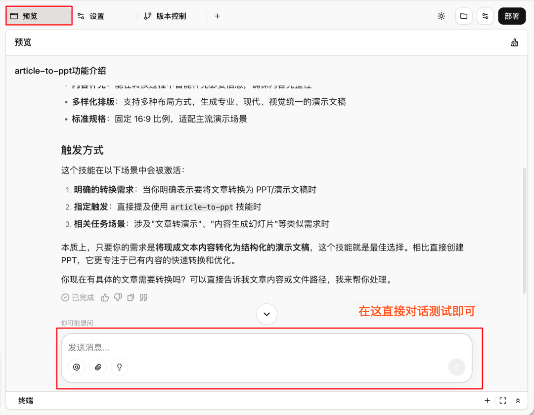 我们可以在右侧的预览区,测试开发好的 Skill。