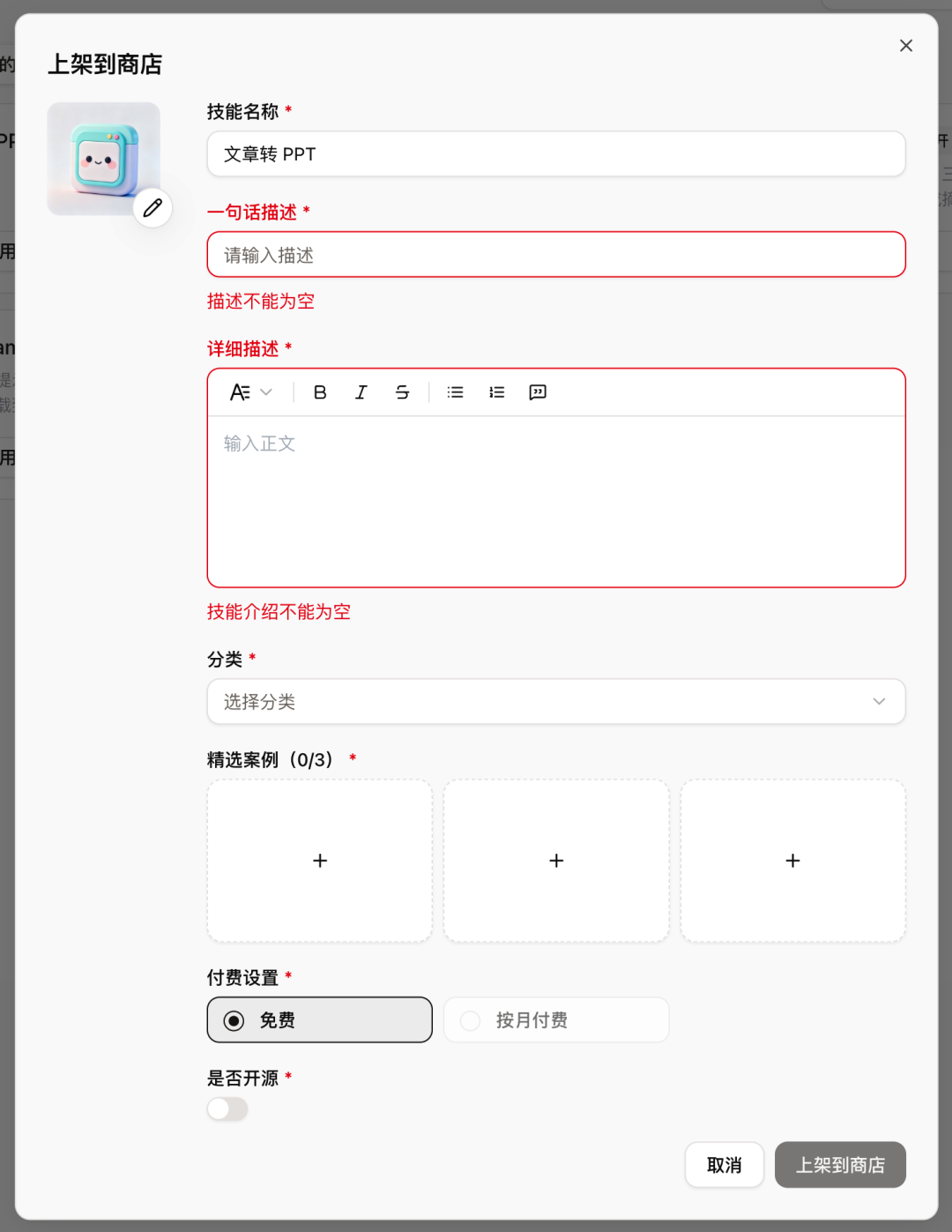 上架流程不复杂,按提示填写技能名称、简介、封面图,选择分类,提交审核即可。