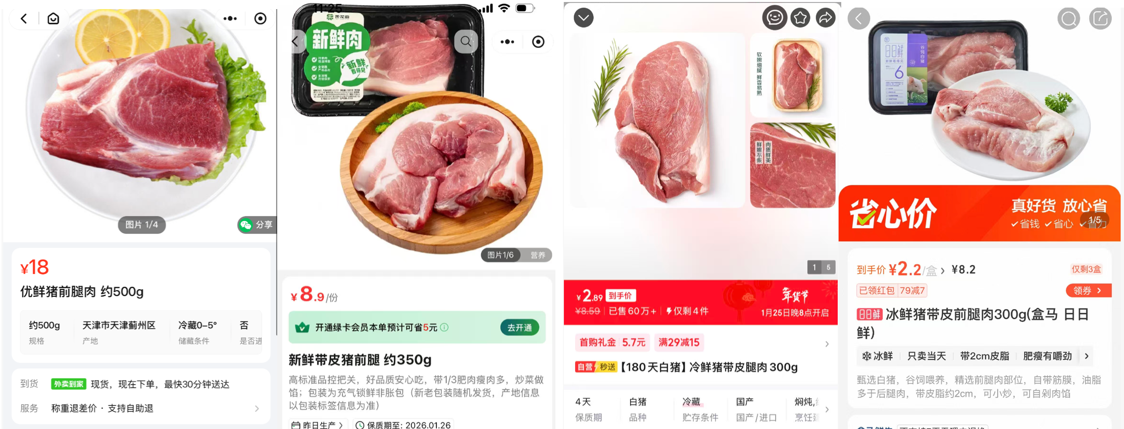 AI蓝媒汇对比了各平台价格,以500g猪前腿肉为例,优惠前,钱大妈、叮咚买菜、七鲜、盒马(下图从左到右)的价格分别为18元、12.7元、14.3元、13.7元,钱大妈价格比主流平台高出约30%。