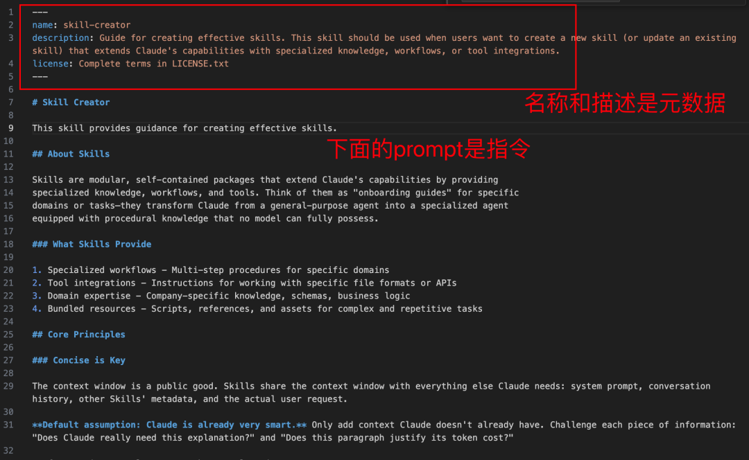 核心文件就是SKILL.md。这里面其实就包含了这个Skill的名字、描述(有什么用,什么时候该用),以及Prompt(指令)。