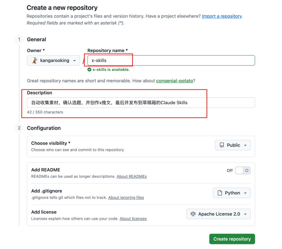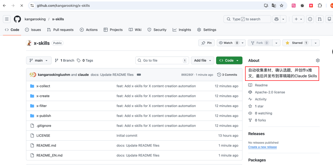 这篇本来就是奔着写Skills并开源去的,所以我直接先在我的Github建了个公共仓库,为了简单好记,我给它取名叫x-skills