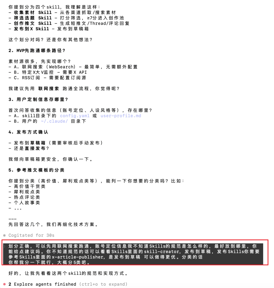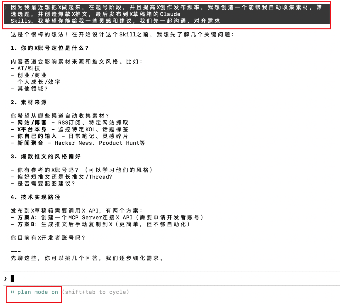 切换到Plan Mode,先跟Claude Code对话制定一个计划。Prompt: 我最近想把X做起来,在起号阶段,并且提高X创作发布频率,我想创造一个能帮我自动收集素材,筛选选题,并创造爆款X推文,最后发布到X草稿箱的Claude Skills。我希望你能给我一些灵感和建议,我们先一起沟通,对齐需求。