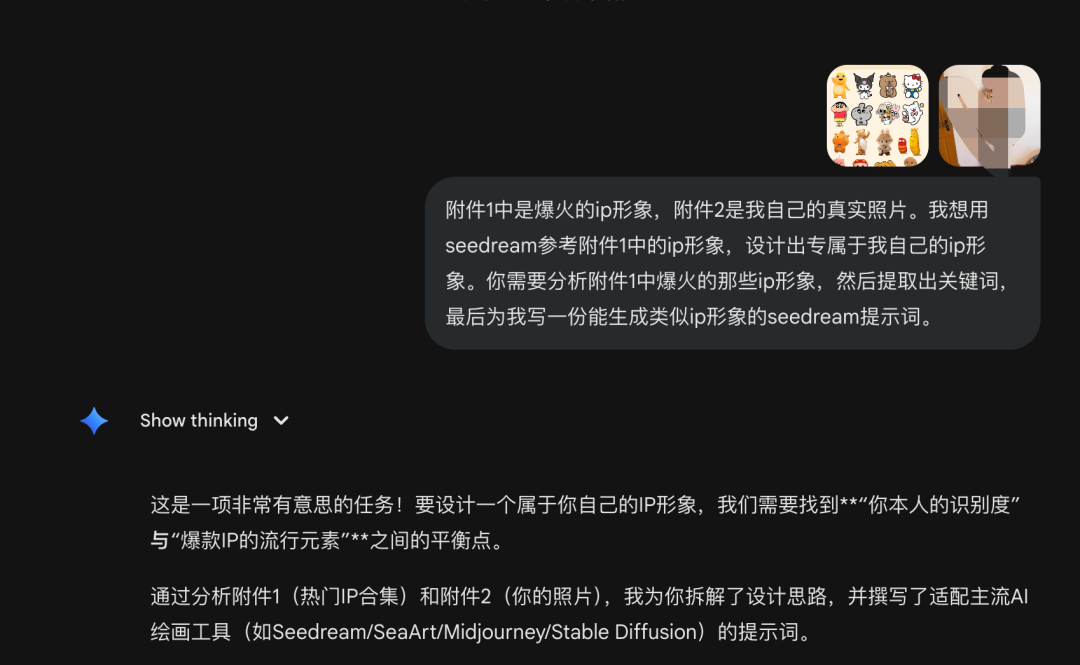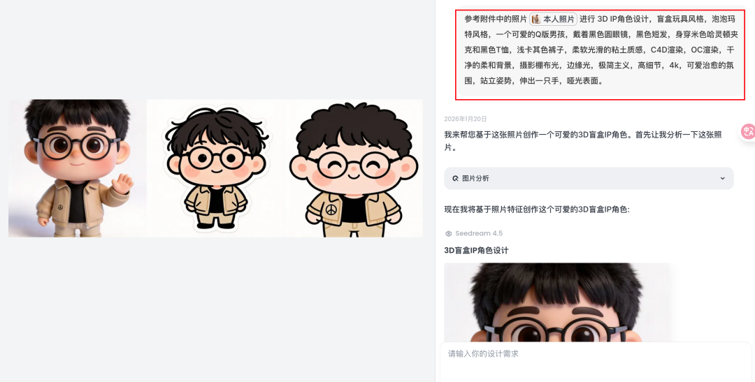 我直接把上一步Gemini生成的提示词和一张我自己的照片发给星流Agent,让它参考生成类似的IP形象。