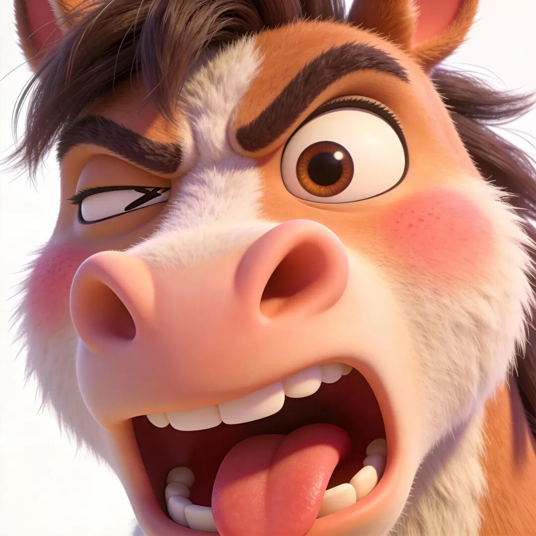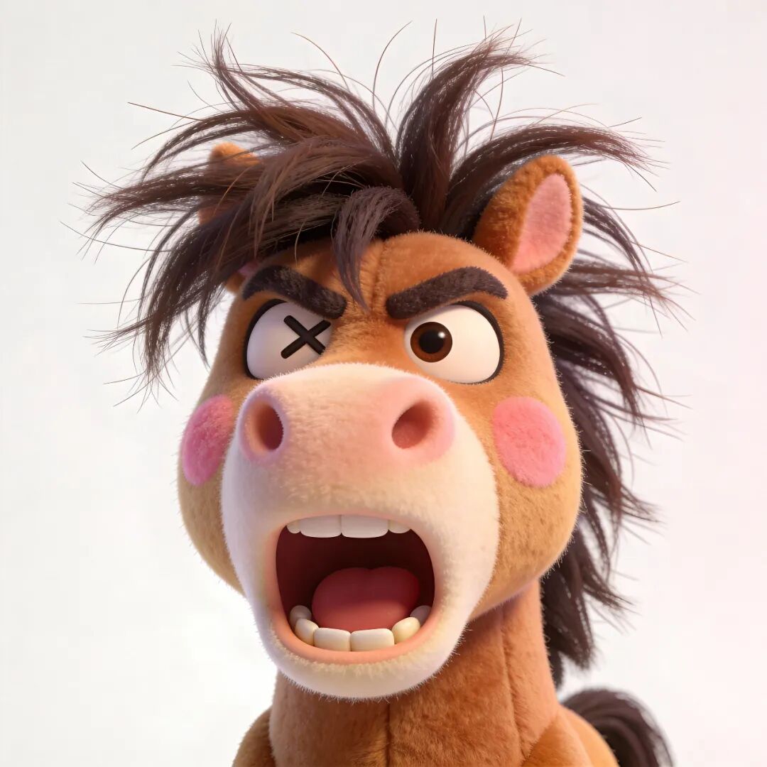 错误提示词:生成3D渲染,迪士尼皮克斯风格,拟人化的马,IP设计,极度详细的毛发细节,C4D渲染,Blender,8k分辨率,盲盒玩具质感。极度特写,滑稽表情,斗鸡眼,大鼻孔,张嘴露牙,凌乱的鬃毛,直视镜头,傻得可爱的脸,震惊,下巴掉下来的表情包图