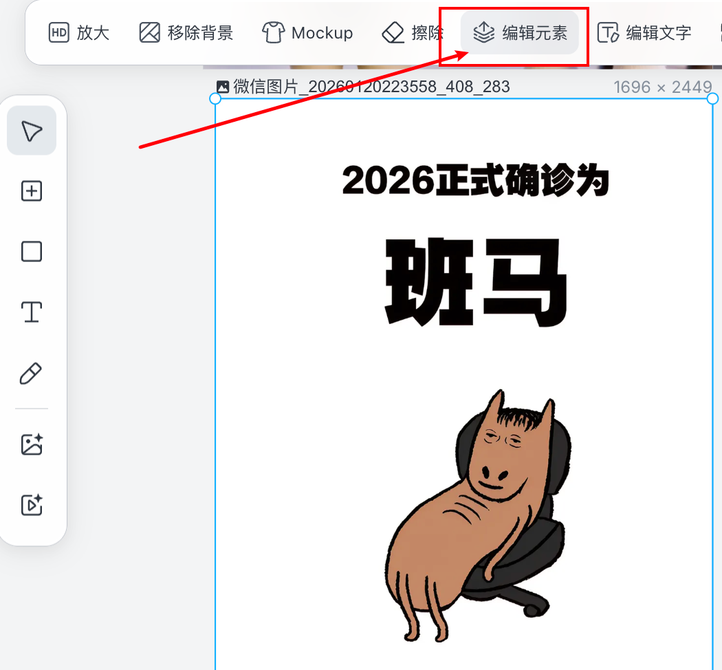 我收藏了一张特别搞笑的班味儿梗图,想把中间的主角换成我的马年表情包,再把文案改改。