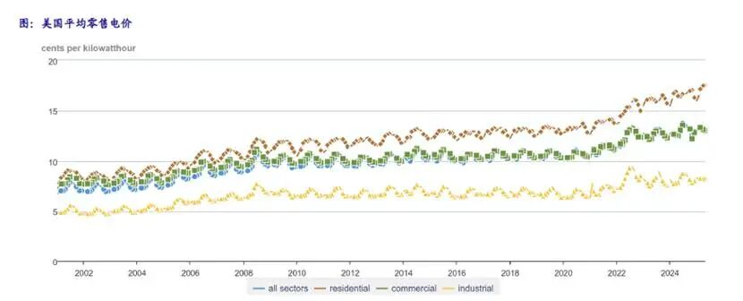 最后的结果就是,在美国由于缺电涨电价的背景下,国内25年的电价实际上是在跌的。