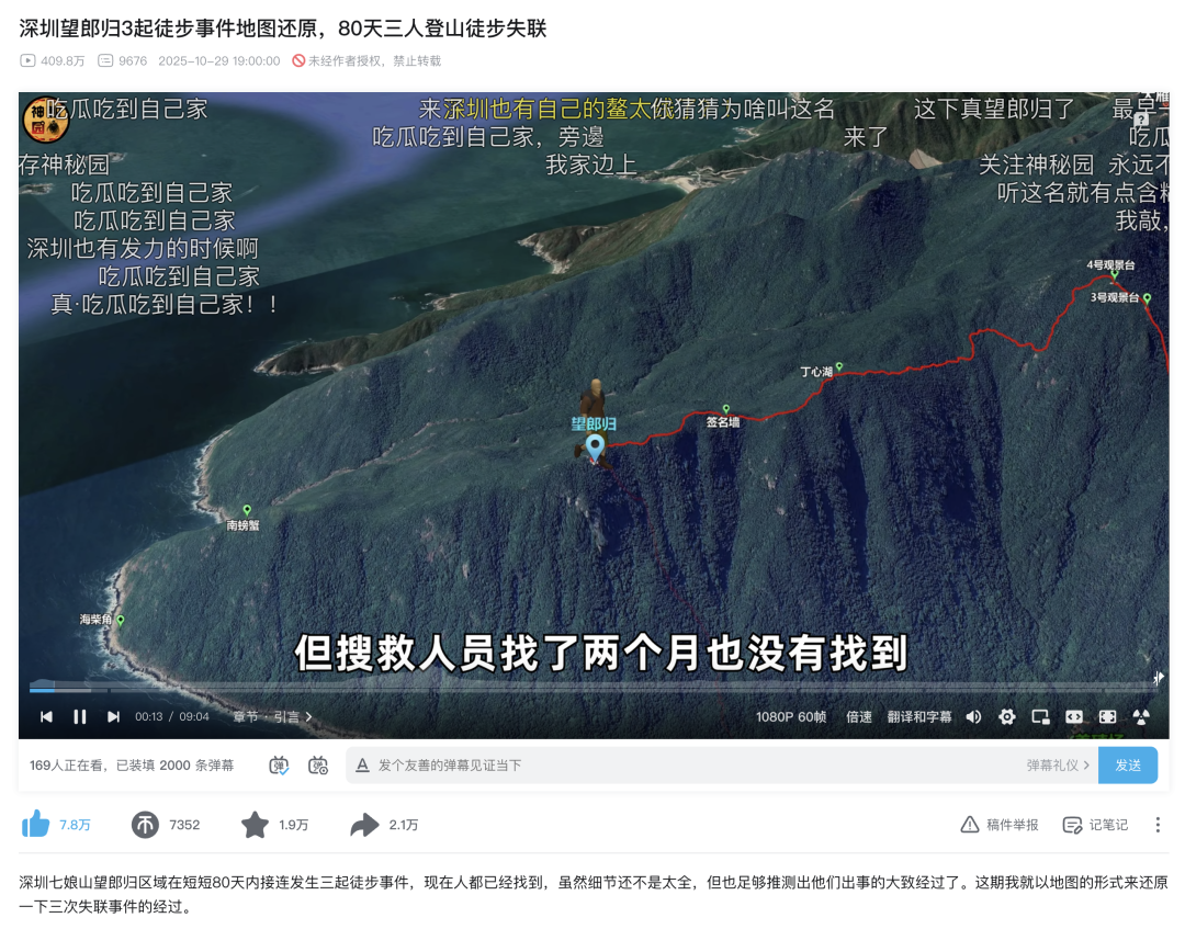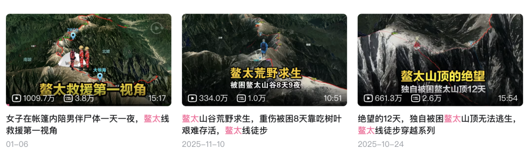 最近两年,他开始更新潜水、探洞以及户外徒步等与个人更相关的事故内容时,流量迎来了指数级暴涨。@神秘园 视频中很少煽情渲染,也不卖惨博流量,只是冷静还原每一起事故的“真实”细节(大多基于相关报道)。他的走红固然源于自身优质的内容,更与近年来中国户外运动的爆发高度契合。