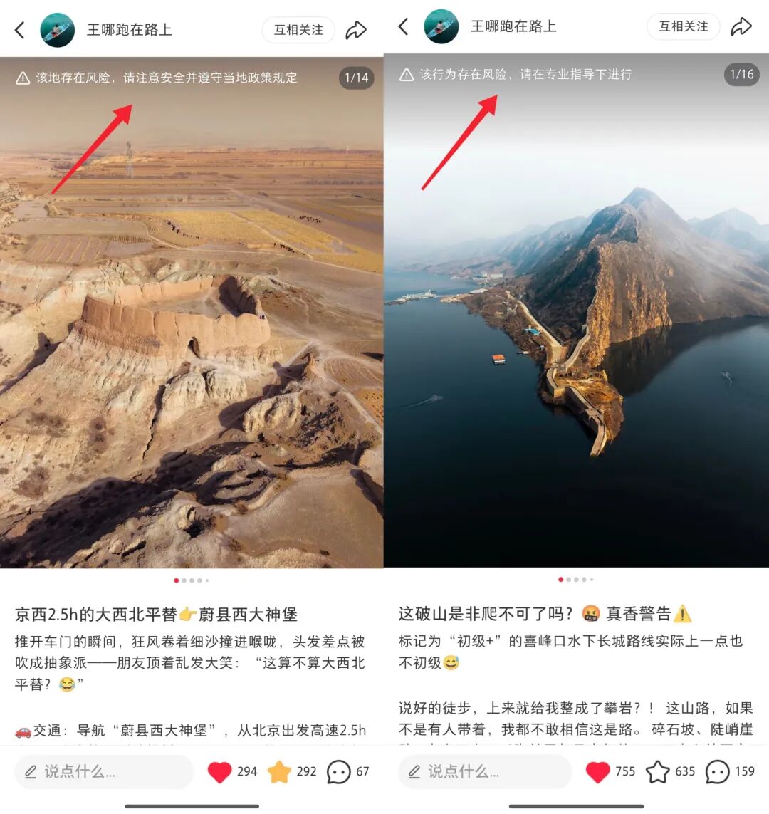 更多人会指责社交平台的算法、推荐机制。平台当然有大幅优化空间,这两年许多户外帖子会被标注为“该地存在风险”,但平台也不能把所有户外、有风险的内容都封掉吧?