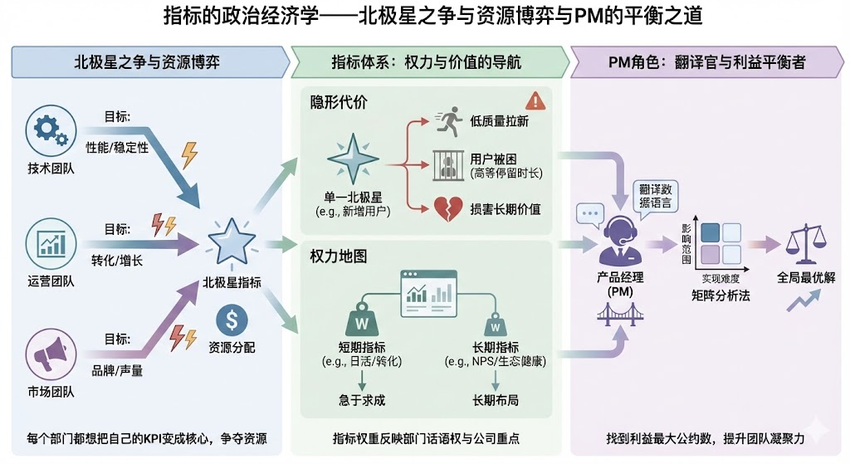 聊到指标体系,很多人会觉得这是个纯技术问题,把目标拆解清楚就行。但如果你在大公司待过就会知道,指标的设立从来都是一场没有硝烟的战争。每个部门都想把自己的KPI变成公司的核心指标,因为这直接关系到资源分配。产品经理夹在中间,既要懂业务,又要懂“政治”,这门学问可深了