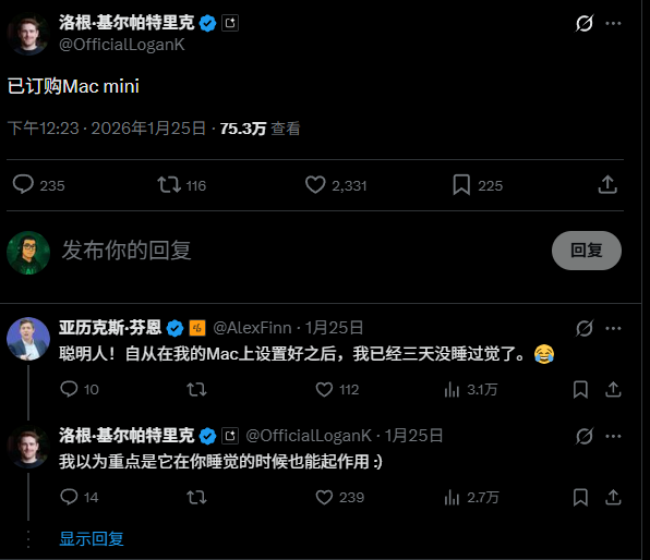 甚至连Google DeepMind的AI Studio负责人Logan Kilpatrick都发文说”Mac mini ordered”(我刚下单了一台Mac mini)——一个Google的AI负责人,公开表示去买苹果的电脑来跑开源AI项目,这个画面本身就充满了戏剧性。